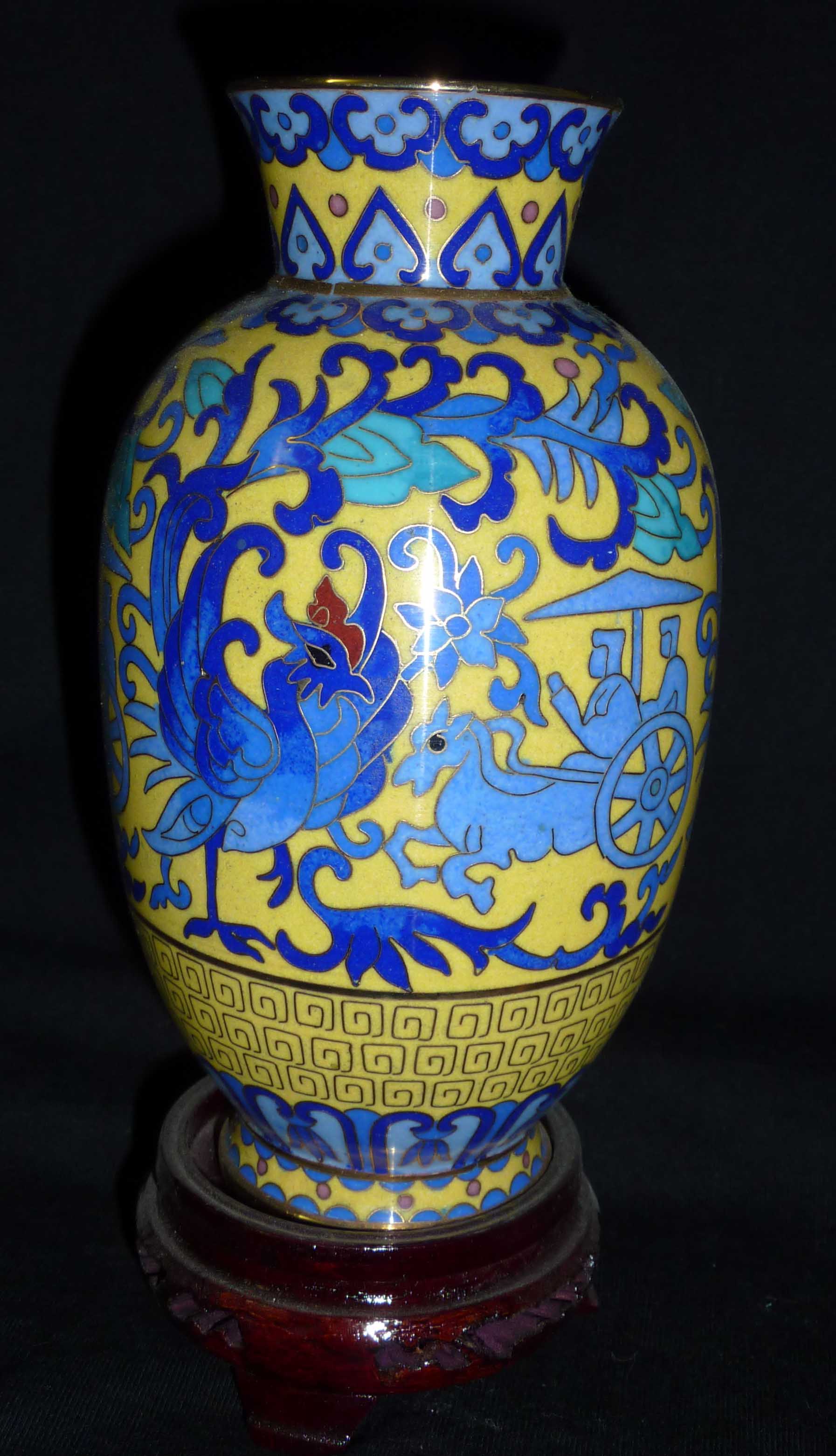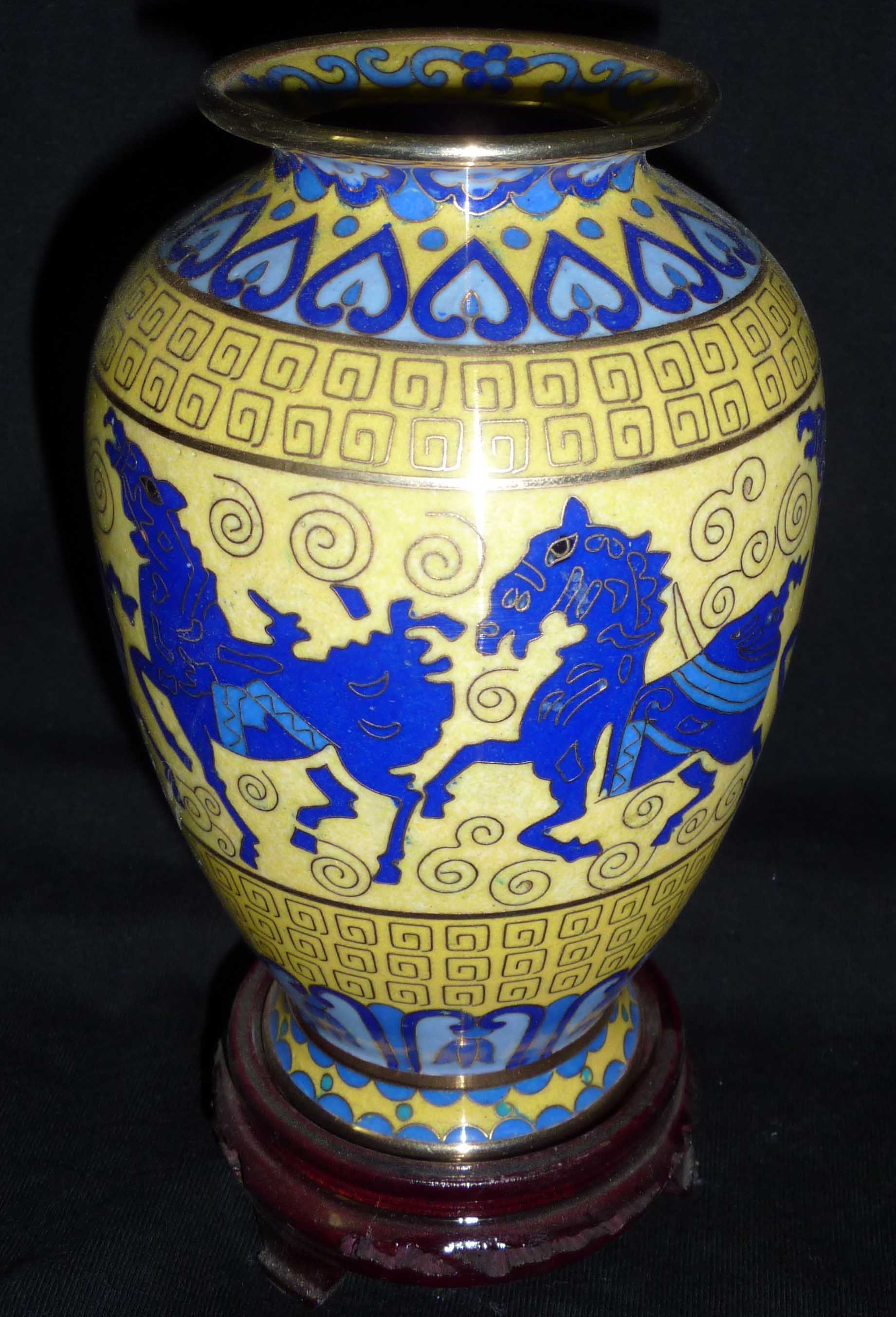 The vases I bought (after negotiating the price) are yellow with a blue trim. One has a blue dragon on it, the second a phoenix beside a chariot, and the third running horses. Each one is about the size of my hand (see photos)