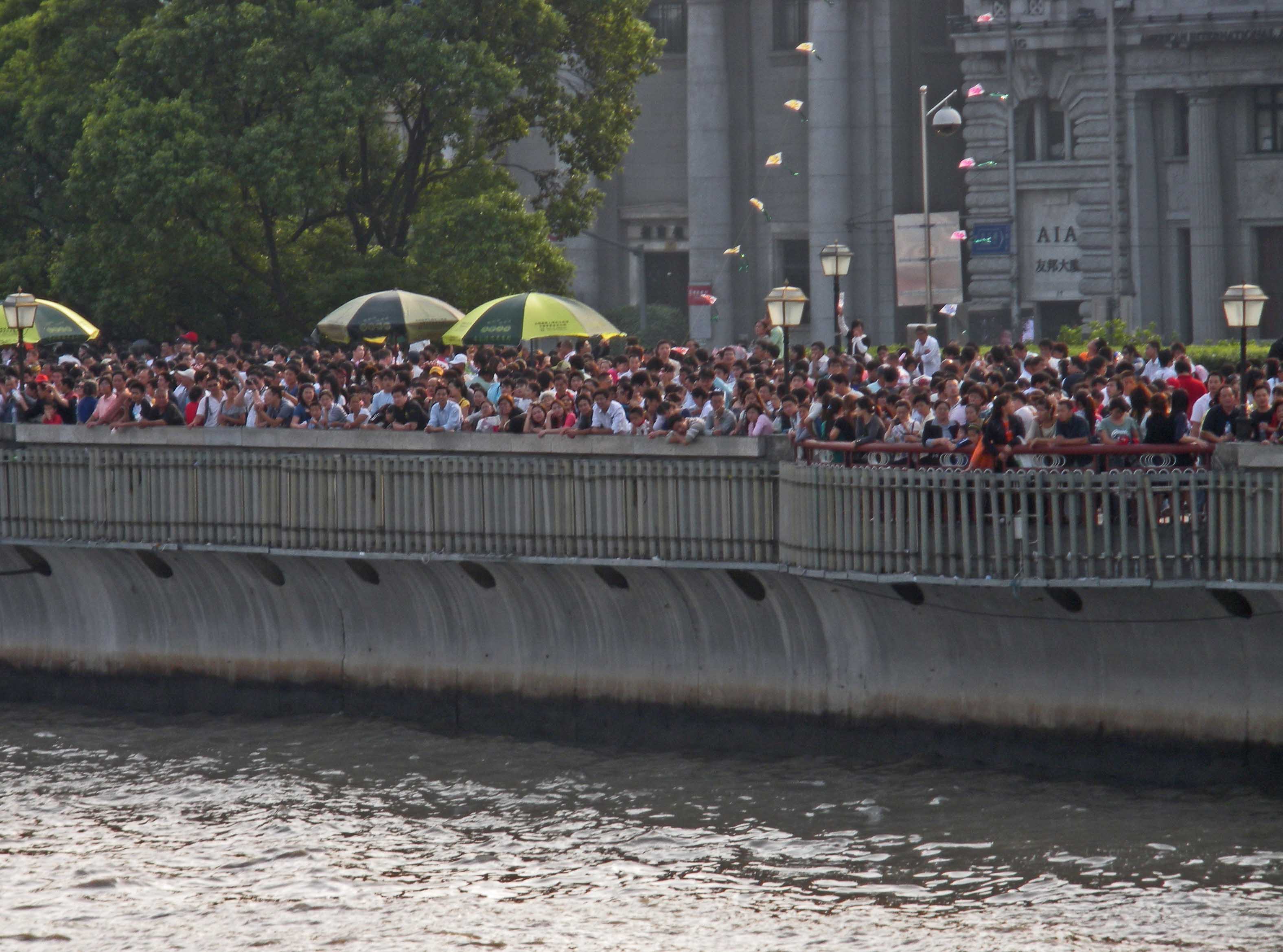 A close up of the crowded Bund on the Shanghai side of the river